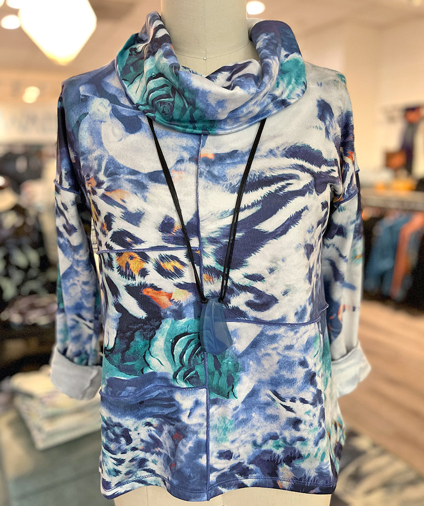 David Cline's soft, playful tops are always a go-to for fun weekend looks. This season they've introduced a new fabric, a soft and stretchy mid-weight knit in a brushed knit that feels as good as it looks. We love the bright print in shades of blues, aquas, and more on fresh white to keep things bright. Overlock seaming adds another layer of fun. This one has a classic DC fit, with a soft, straight, not-too-big cut, a soft draping cowl neckline, and long sleeves. Pop on a bold necklace and your favorite jean or black pant and get ready to smile.