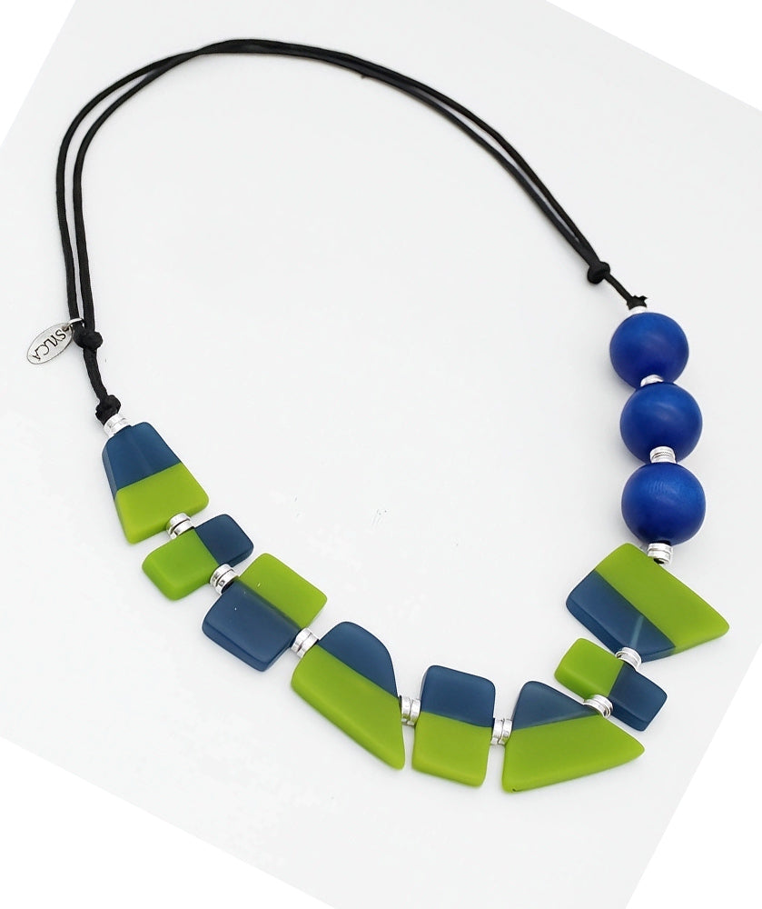 Turn heads with this vibrant statement piece crafted from striking blue and lime resin and wood beads. This bold color combination brings a touch of tropical flair perfect for adding energy to any outfit. Lightweight yet eye-catching, this necklace is designed for those who embrace their unique style with confidence. Whether paired with a casual ensemble or a night-out look, this one is sure to make waves.