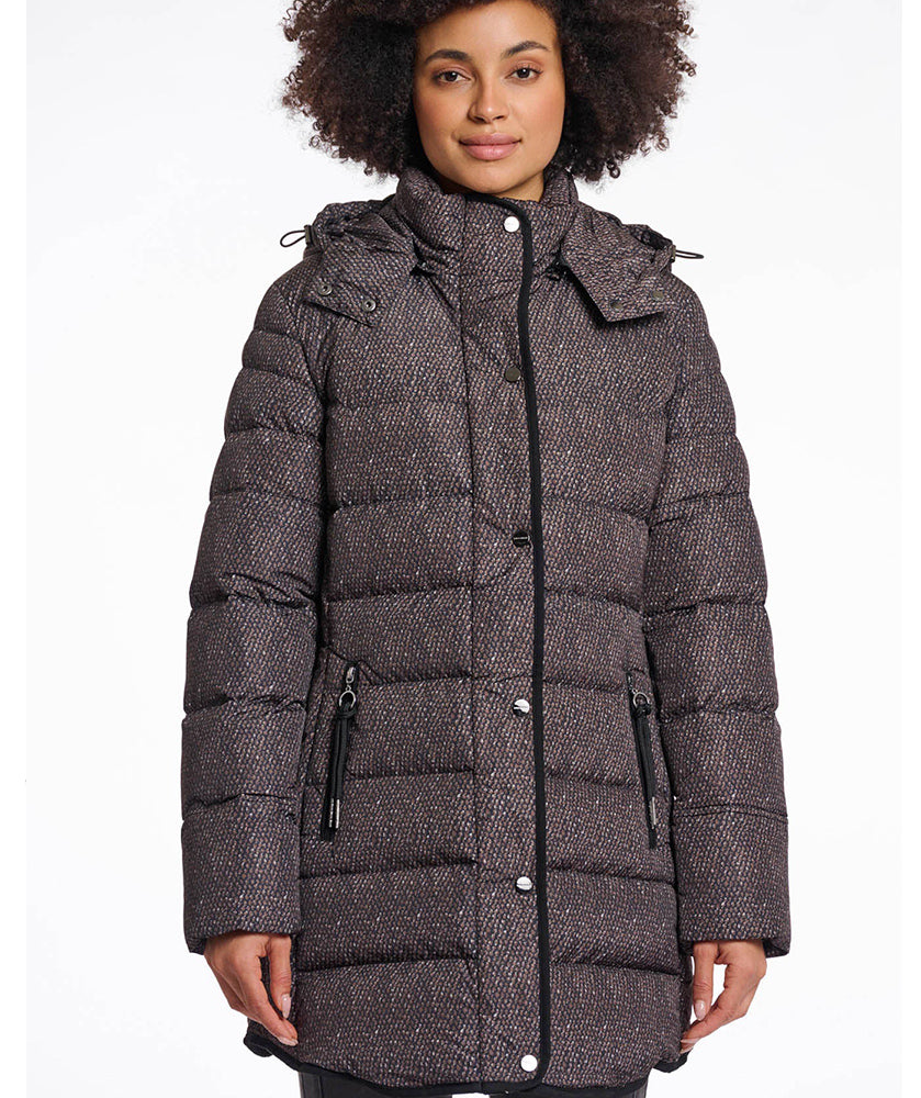 Keep things fun while staying warm with this gorgeous puffer coat in a beautiful abstract dot print in rich black, brown, and grey. A high neck collar, storm cuffs, removable hood with cord stopper, and zipper and snap front closure will keep you extra snug this season. The cool black trim and cord detailing, plus the flattering quilted pattern and straight hip length cut adds a big dose of style... you won't feel like you're wearing a sleeping blanket like you do in those big bulky puffers.