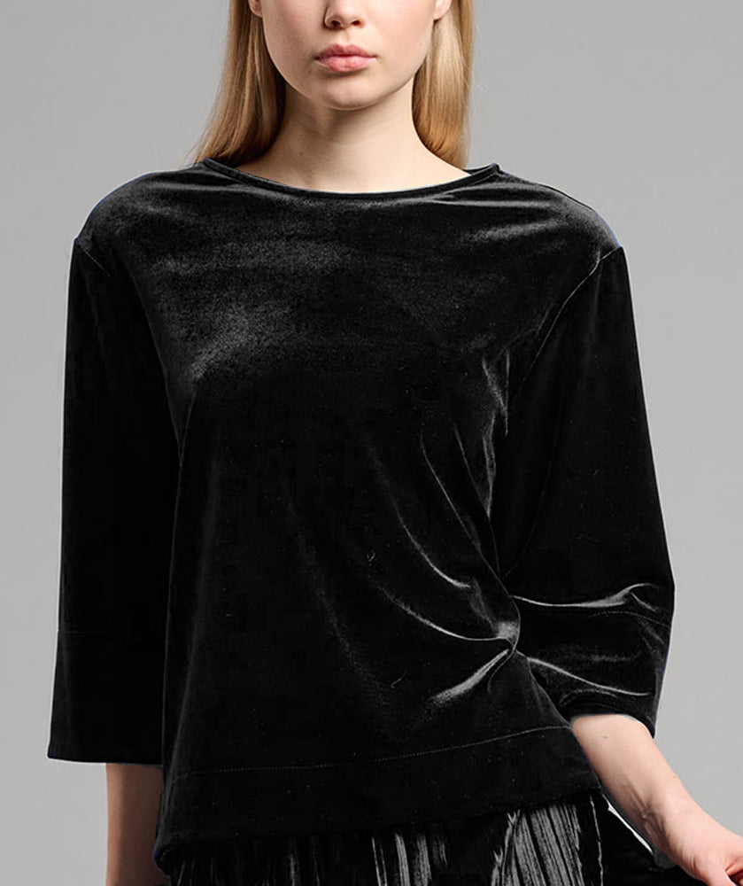 A soft and simple top in luxe stretch velvet in deep black with a beautiful sheen. The soft a-line shape, 3/4 sleeves, and simple, just-right seaming make this the perfect dressy top to add to your closet. Pair it with the matching velvet pant for a chic, sophisticated look, or pop it on over any pant of your choice for an elegant outfit finish.