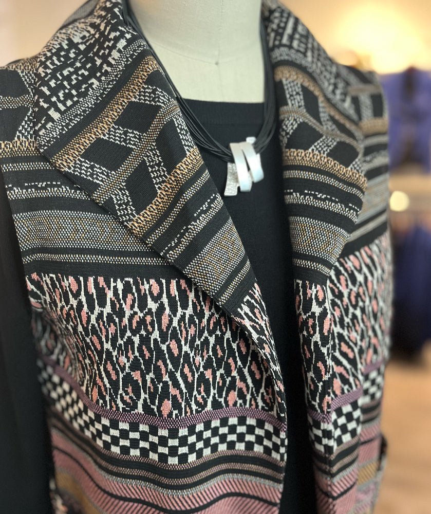 Make a statement, while still feeling tailored, in this fun and artful vest. The softly structured, muted yet lively jacquard knit is uniquely beautiful... it can easily layer over black for the office, or jeans for the weekend. With a shawl collar, a simple, straight, and relaxed silhouette, plus two front patch pockets to adds simple sophistication. The medium measures about 31" long at center back, and about 42" around.