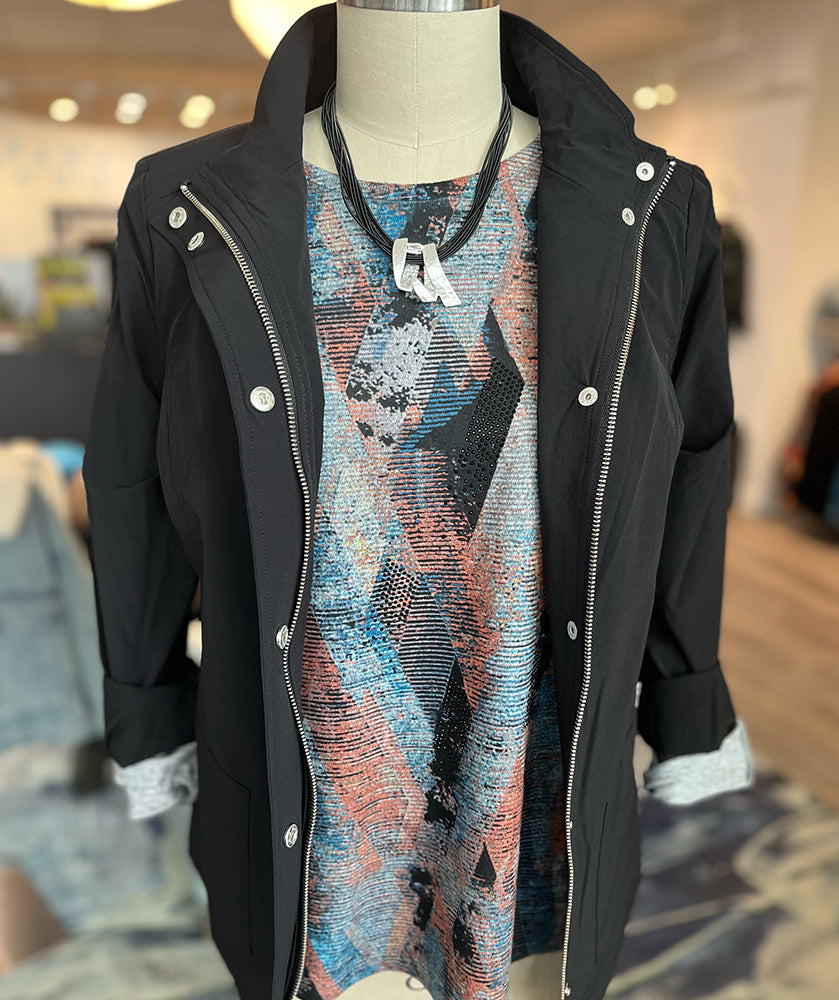 We love a fun printed tee... and this one is made in a super soft brushed knit that's perfect for fall layering. The soft textured geo print comes to life in terra cotta, shades of blue, and black on a heather grey background. A smattering of carefully placed tonal crystals adds a bit of subtle depth, sparkle, and shine. Layer it under your favorite black jacket, pop on your favorite jeans, add a fun necklace, and you're set for a perfect fall day.