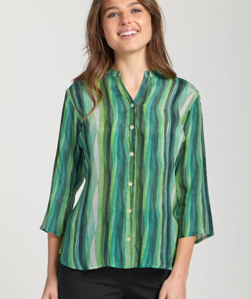 Soft, calming waves of green add a deliciously soft feel to a tailored shirt. The soft and flowy fabric balances the clean styling of this fun shirt that's great on its own or worn open over your favorite white tee. A classic straight fit with a slightly longer hi-lo length, mandarin collar with full button placket, and 3/4 sleeves.