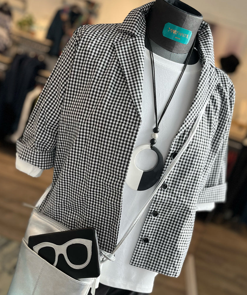 You're going to fall in love with this one! A short, boxy shirt jacket in a fun black and white gingham print that adds a playful pop to so many outfits. The short style has a covered front button placket closure, half sleeves, and a notched collar. Wear it open over a black tank and pair it with the matching gingham wide leg pant... or mix it up with a jean and a pop of color underneath. No matter how you style it, you're going to look fabulous! This piece has a relaxed fit, so you can size down for a slightly more trim fit.