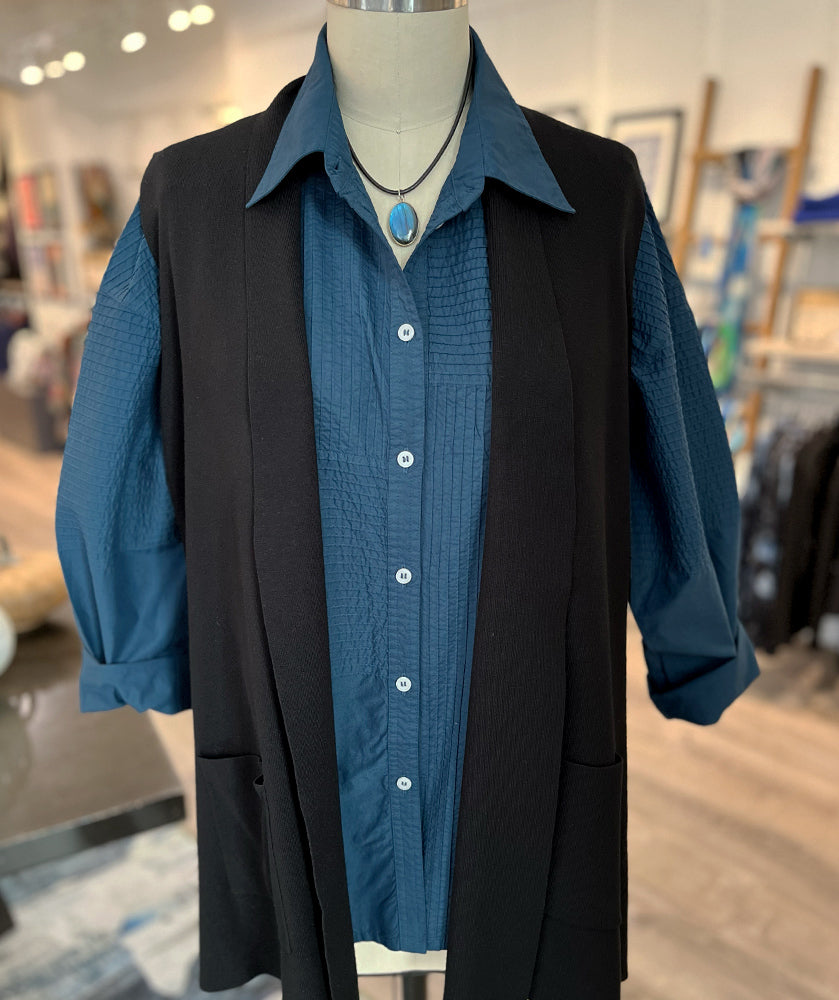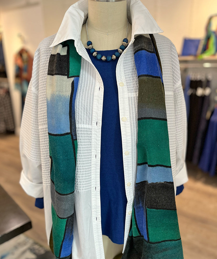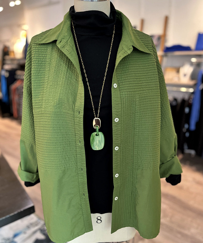 Yacco Maricard's allover signature pintucked detailing comes to life in a modern look. The fun mix of directional lines feels artful and architectural, and the rich colors bring the piece to life. We love this new design from Yacco, with a longer hip length cut, a relaxed long sleeve, and classic button down styling. Wear this one size piece on its own, or layer it up, all season long. One size, best on sizes 12-16. This shirt is about 26" long from shoulder seam to hemline, and about 48" around the body.