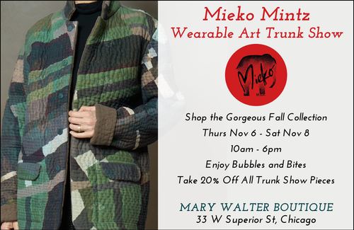 Come shop a specially curated selection of handcrafted Kantha jackets, shirts, & vests from Japanese-American artist, designer, and visionary Mieko Mintz!