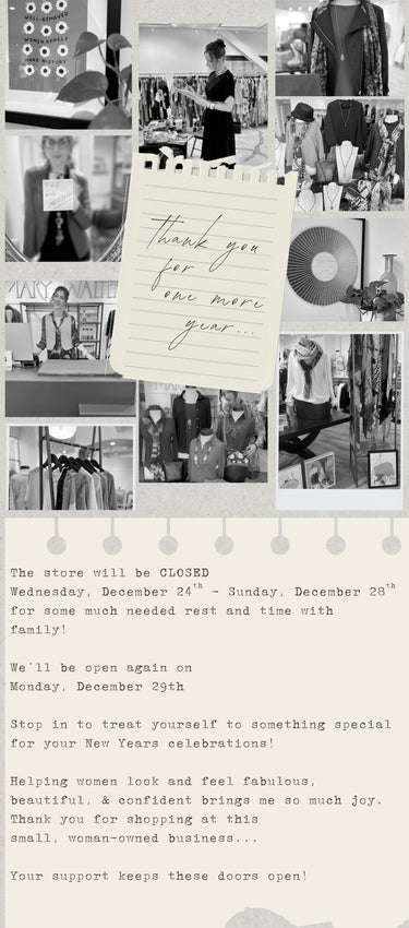Mary Walter has been my “go to” shop ever since I discovered it several years ago. I live 200 miles away so most of my shopping is on line. Even from afar, Erin has made suggestions for my wardrobe (and body type) that have been spot on. Last December I was able to visit the shop in person and experience the personal customer service experience first hand. The on-line selections are only a fraction of what is available in-shop and of course the opportunity for real time styling was fantastic.