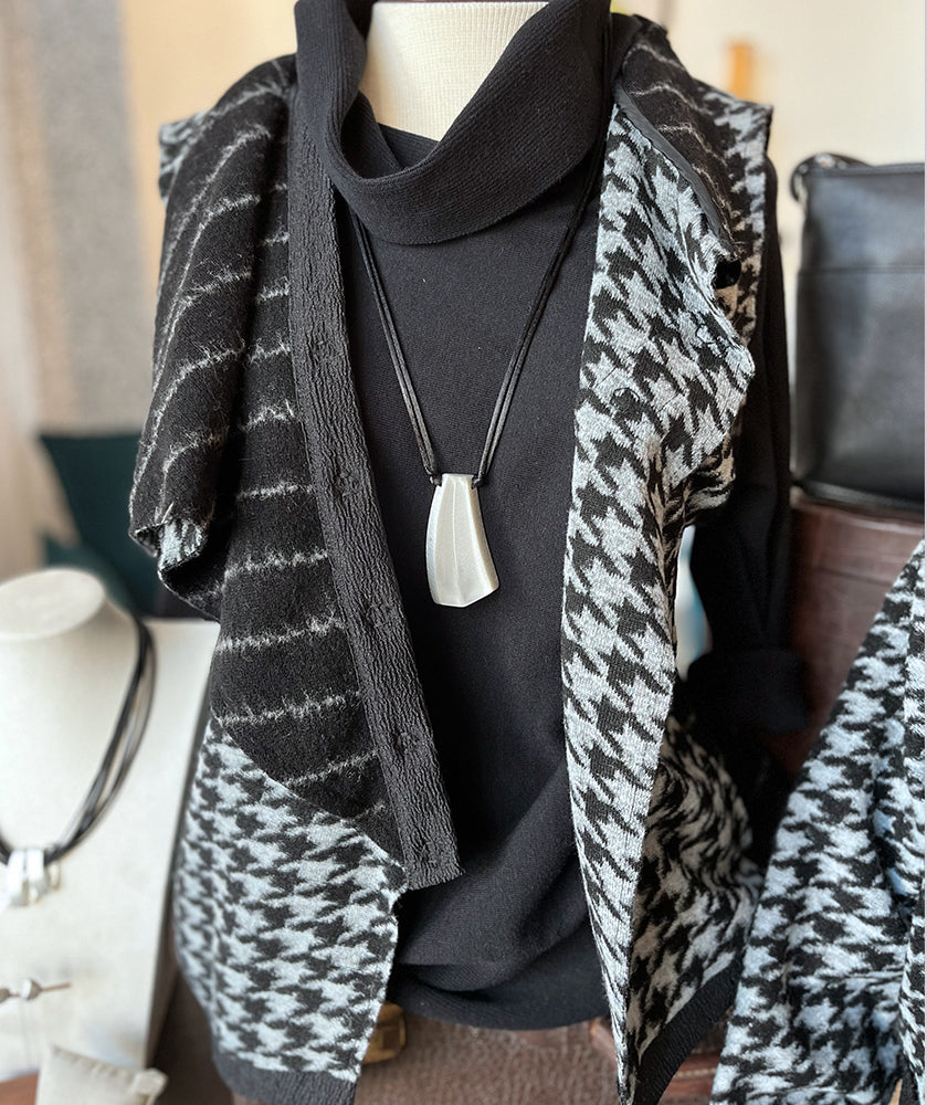 ✓ A unique sleeveless vest crafted from a thick, wool-blend knit in a fun mix of houndstooth and pinstripe print motifs in bold black and grey.