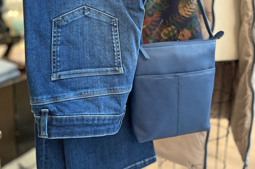 We love these gorgeous new wool and silk blend scarves that just arrived, and this stunning blue and neutral palette brings this whole look together... along with a vibrant labradorite pendant. Don't forget your bag... our perfect crossbody in navy leather goes with everything for a soft alternative to black.
