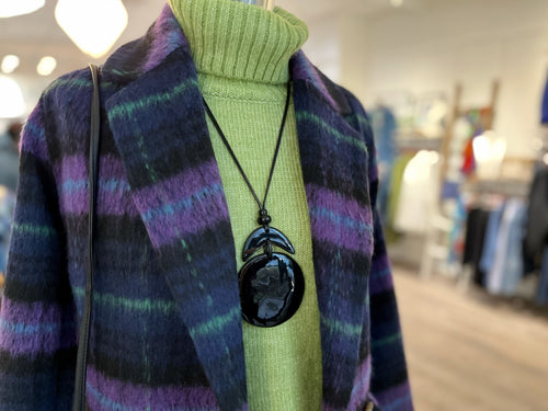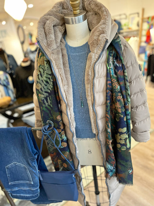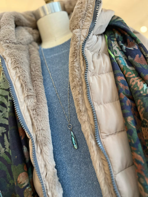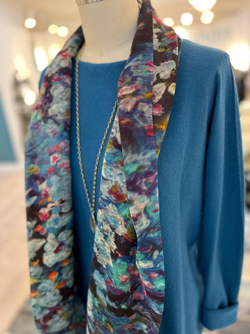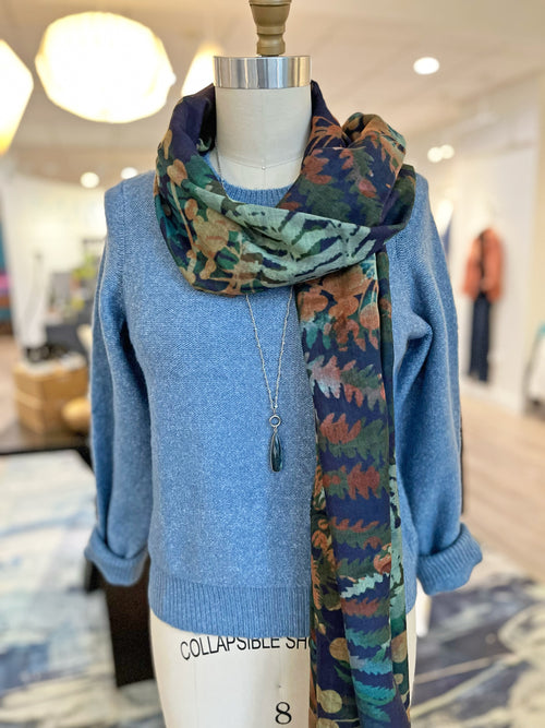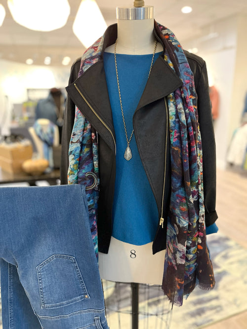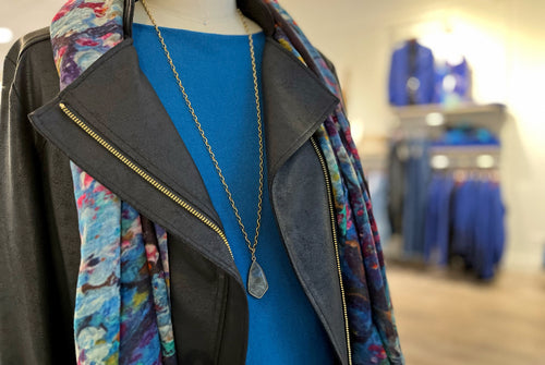 Reach for a gorgeous scarf, like this beautiful multicolored one in a lush wool and silk blend... the gorgeous floral print is a subtle nod to brighter days. Add a long necklace to lengthen and add another layer of fun... a labradorite pendant is always a winner, picking up that gorgeous blue hue and adding to your sparkle!