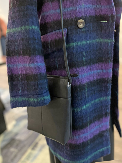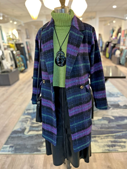 Don't reach for your puffer coat when you dress up... you need a fabric coat, like this fun plaid number from Foil- to keep your outfit elevated while bundling up. The black base keeps it versatile, while the bold shots of color- purple, lime green, bright blue- add a pop of unique fun.