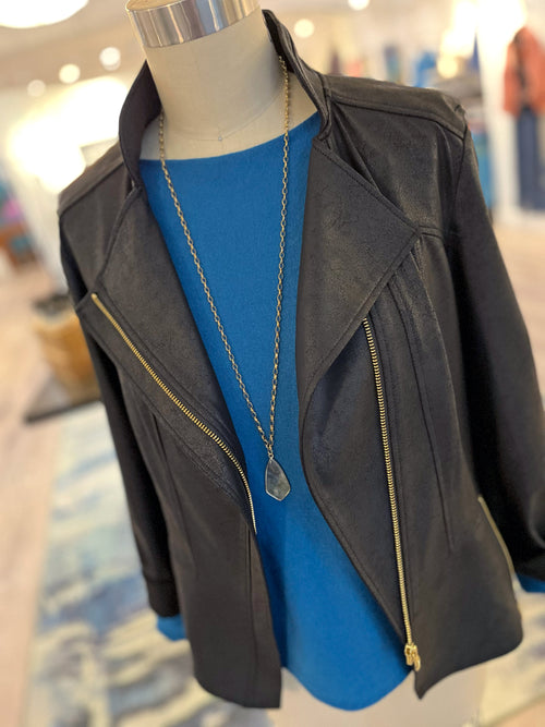 Add some fun with a cool jacket that seamlessly blends comfort and style...Clara Sunwoo's signature liquid leather motos are here in more colors than ever- they're so light and easy, and make you feel polished while adding no bulk at all. On your day off, pair it with a flattering jean, like the straight leg super stretchy Mac Essential Dream Jean (just restocked in all 4 colors!). Then, take the look to the office with a classic pull on pant from Elliott Lauren.